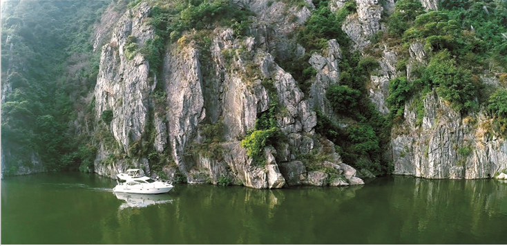 4[行游體驗(yàn)] 湞陽峽:北江精華所在到湞陽峽度假區(qū)旅游,船游北江是首選的一項(xiàng)活動,千萬不能錯(cuò)過。度假區(qū)內(nèi)有個(gè)湞陽峽游艇俱樂部,可以在這里登上輪船或者快艇,去感受北江的魅力。湞陽峽可以說是北江的精華所在,兩岸奇峰聳立,峭壁險(xiǎn)峻,水勢洶涌,據(jù)說為古代水路交通咽喉,兵家防范要地。漢代趙佗在南越稱王后,就于湞陽峽下游不遠(yuǎn)的江口咀筑萬人城,屯兵扼險(xiǎn),阻止?jié)h兵南下。由此可見這里地勢險(xiǎn)要。湞陽峽以其“秀、奇、險(xiǎn)、幻”而聞名,江峽沿岸還有九道灣、八丈石、盲仔石、犀牛石、將軍石等景觀。湞陽峽還是美麗的庫區(qū),沿岸一邊是古時(shí)嶺南荔枝北上進(jìn)貢的棧道,另一邊新棧橋如今是北江最美的公路—— 銀英公路。